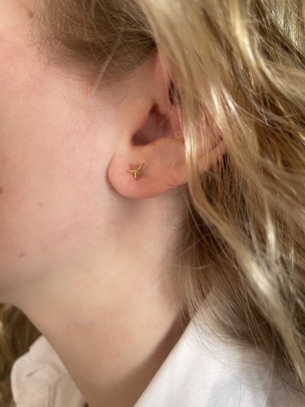 Boucles d’oreilles puces dépareillées dorées en acier inoxydable motif coquillage et étoile de mer.