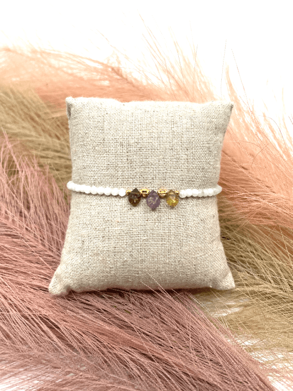 Bracelet composé de pierres de lune de 3mm, d’hématites, de breloques dorées or fin et de tourmalines.